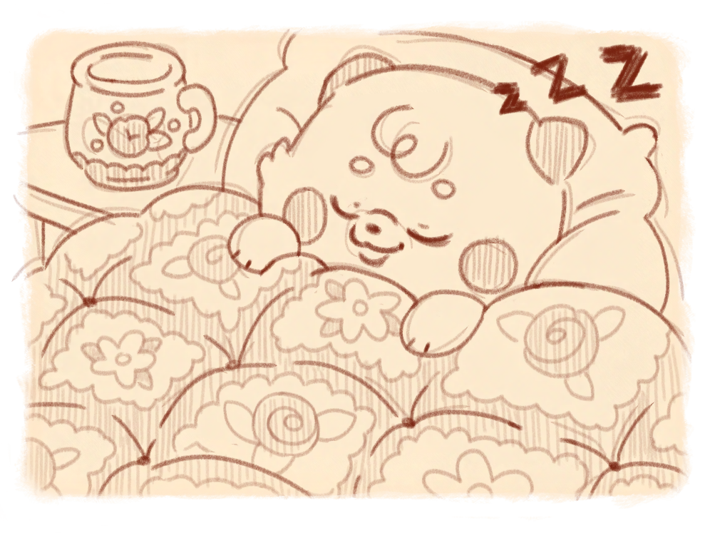 彼はありがたくお茶をすすり、温かいお腹に包まれながら、翌日に備えるためにうとうとと眠りについた。