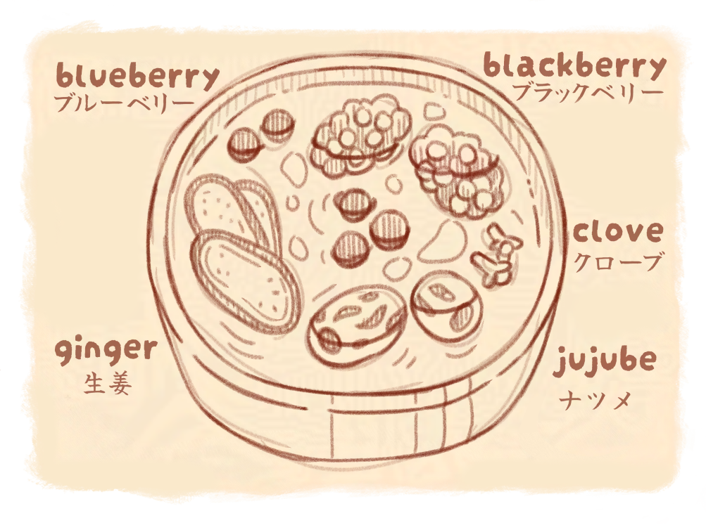In a boiling pot, she added their picked berries, along with ginger, jujube, and clove. Allowing the healing goodness to be drawn out of the food.